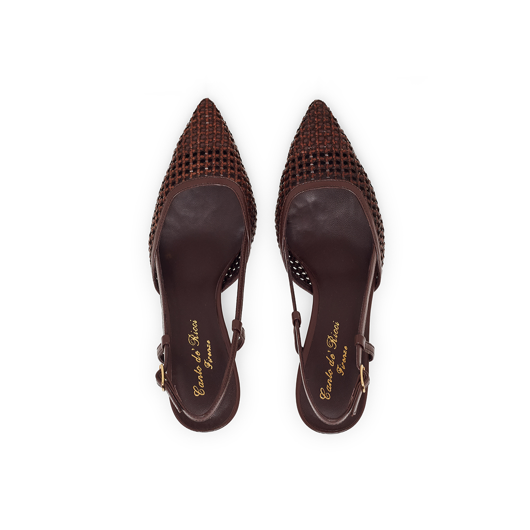 Women’s Heels in Rafia, Unlined, Leather Insole, Leather Sole. The Heel is 5 cm high. For an elegant and formal Look. 100% Made in Italy.