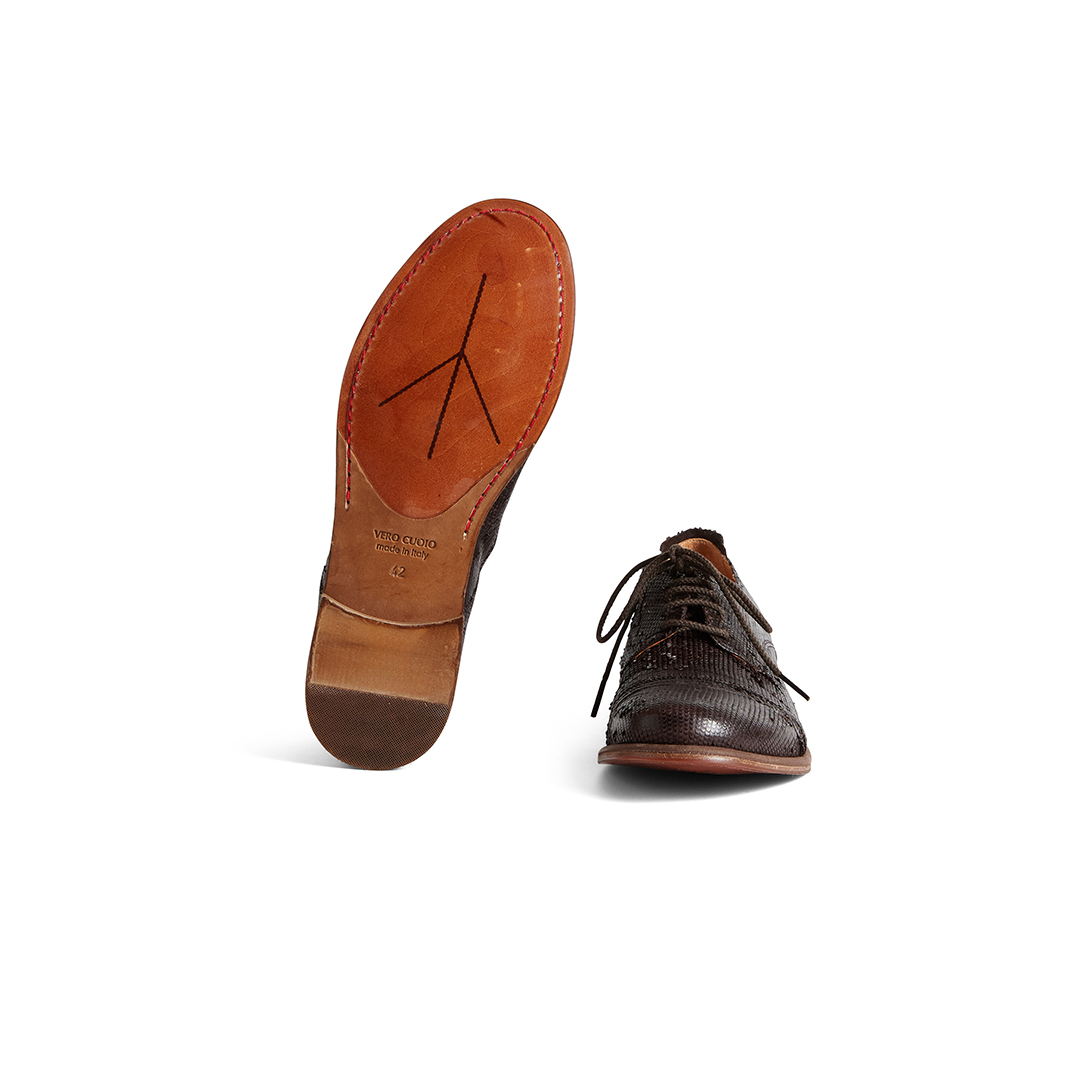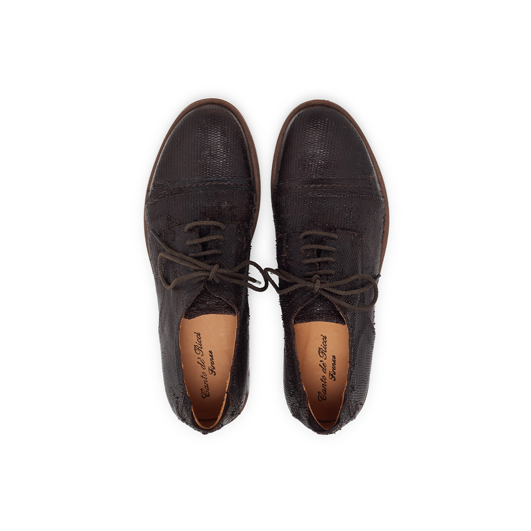 Leather Shoes with an irregular, scale-like surface. Leather + Rubber Sole.