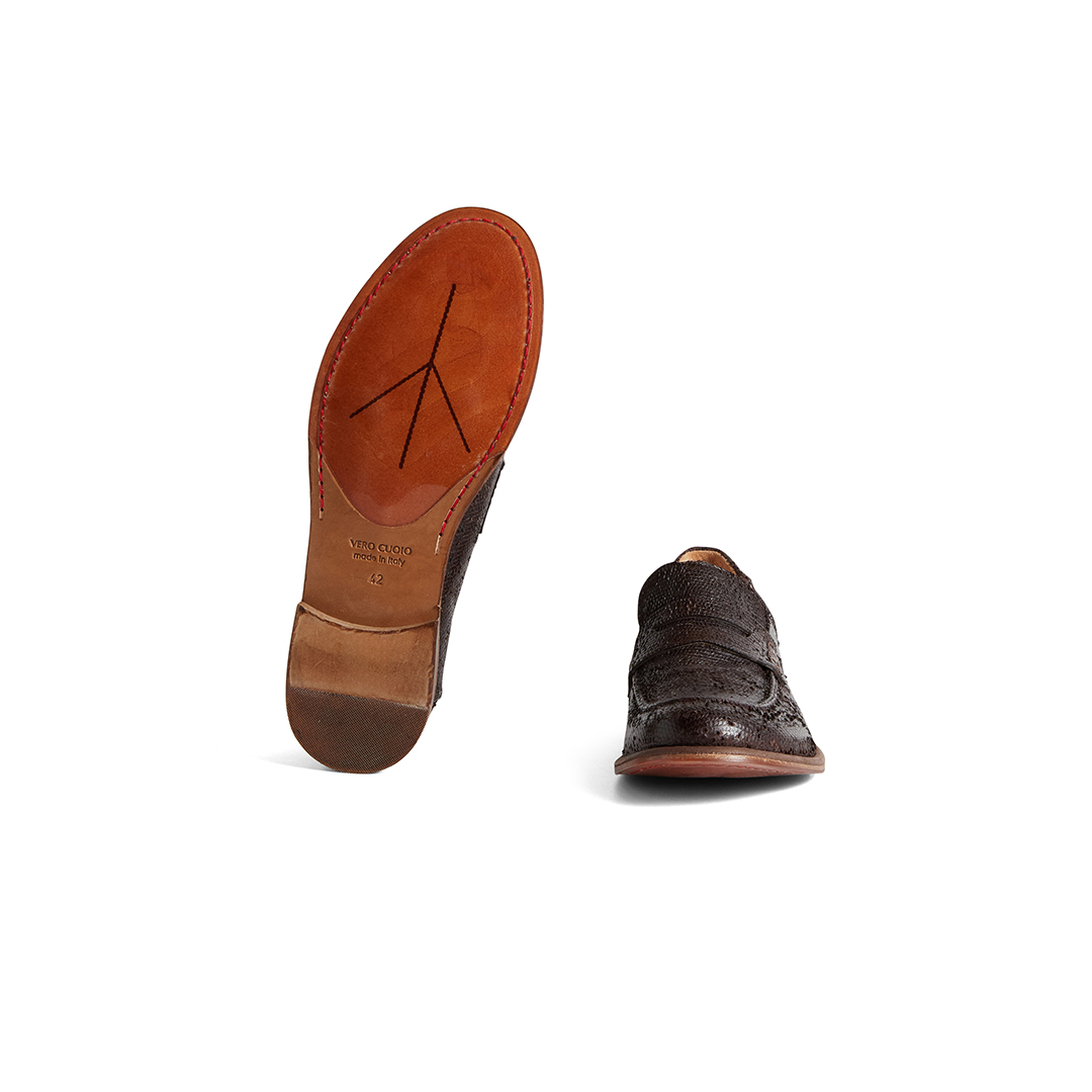 Leather Loafers with an irregular, scale-like surface. Leather + Rubber Sole.